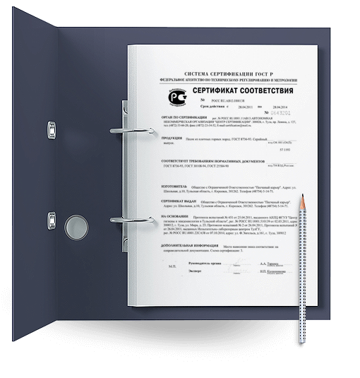 По запросу клиента мы предоставляем сертификаты соответствия на всю продукцию кроме дробленого бетона и боя кирпича.
